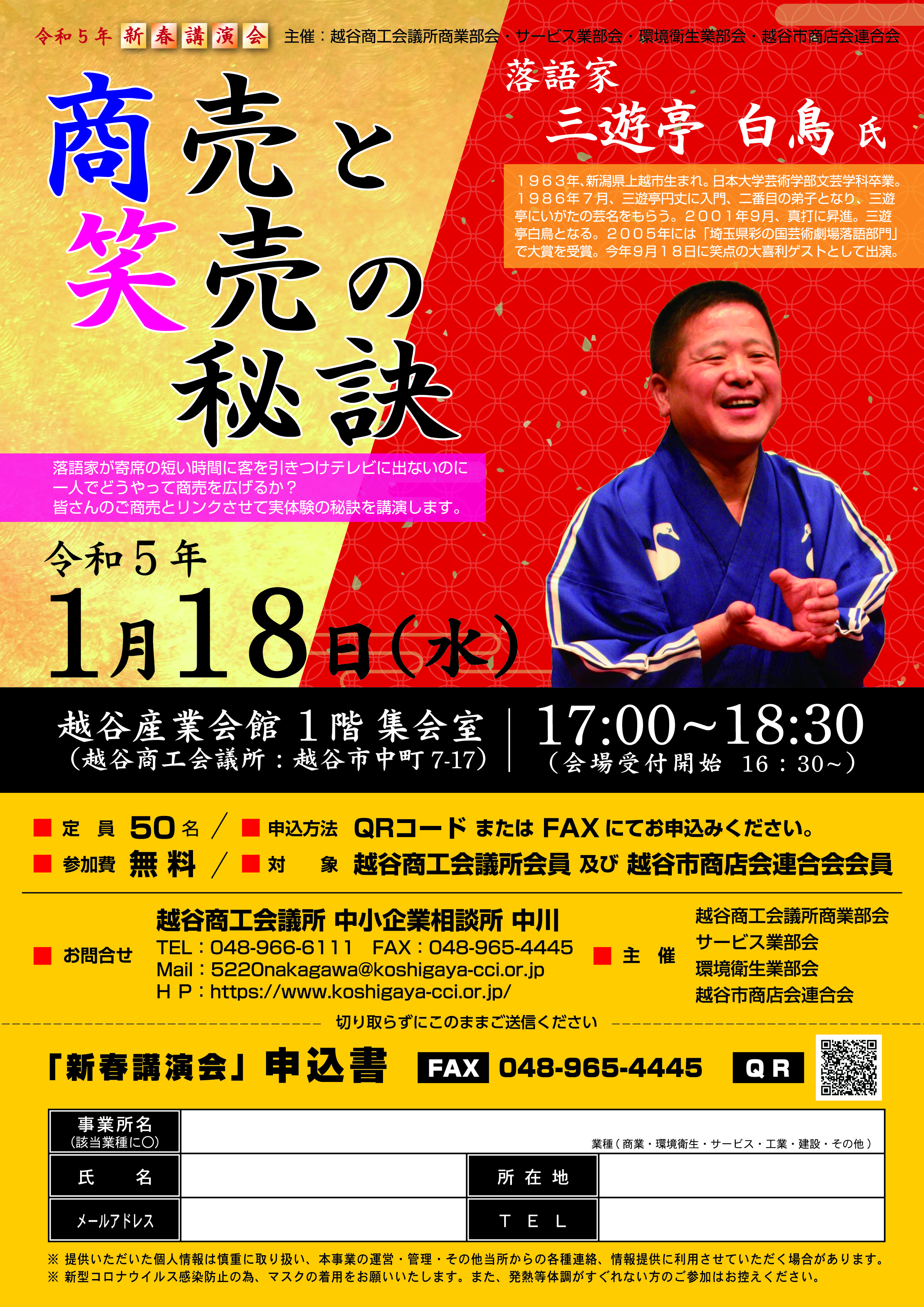 | 備考 | 講師 落語家 三遊亭 白鳥 氏 商業部会・サービス業部会・環境衛生業部会・越谷市商店会連合会共催 |