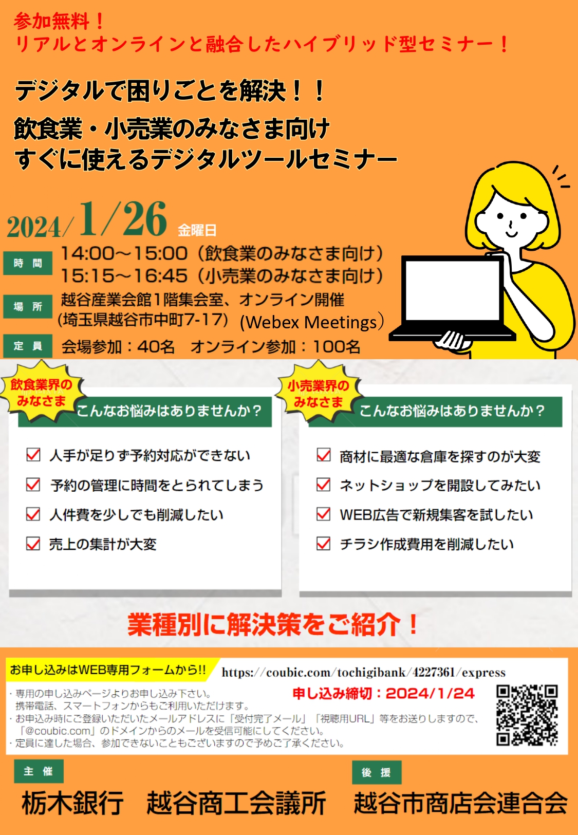 本セミナーでは、デジタルツールや導入事例の紹介を通じ、業務効率化や顧客満足度の向上、売上増加に繋がる実践的な活用方法を専門家から解説いたします。