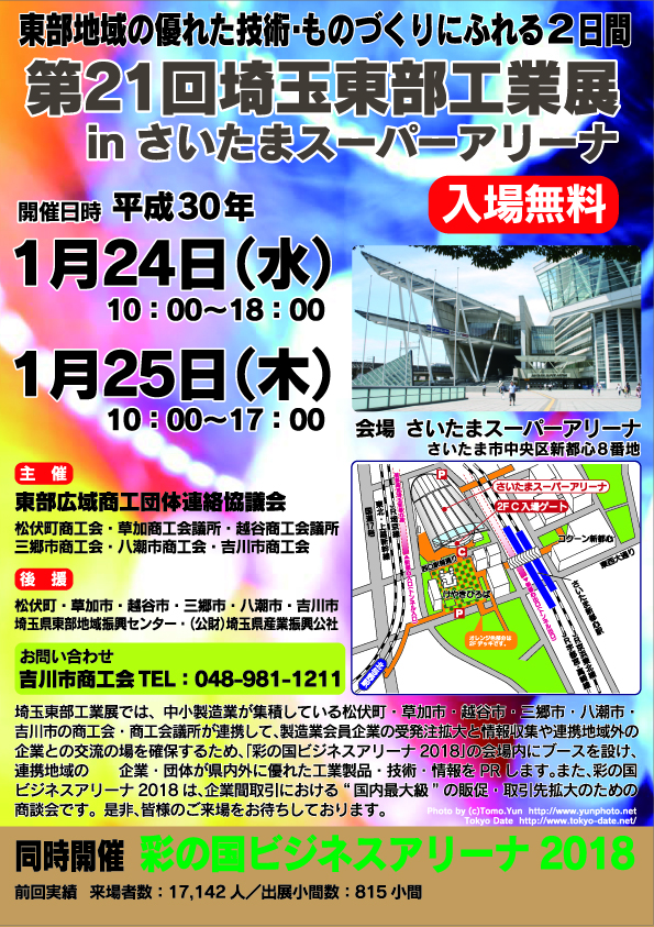 「埼玉東部工業展」は松伏、草加、越谷、三郷、八潮、吉川の5市1町の商工会議所、商工会が連携して製造業会員企業の受発注拡大と情報収集や交流の場を確保するため、「彩の国ビジネスアリーナ2018」の会場内において開催している工業展です。