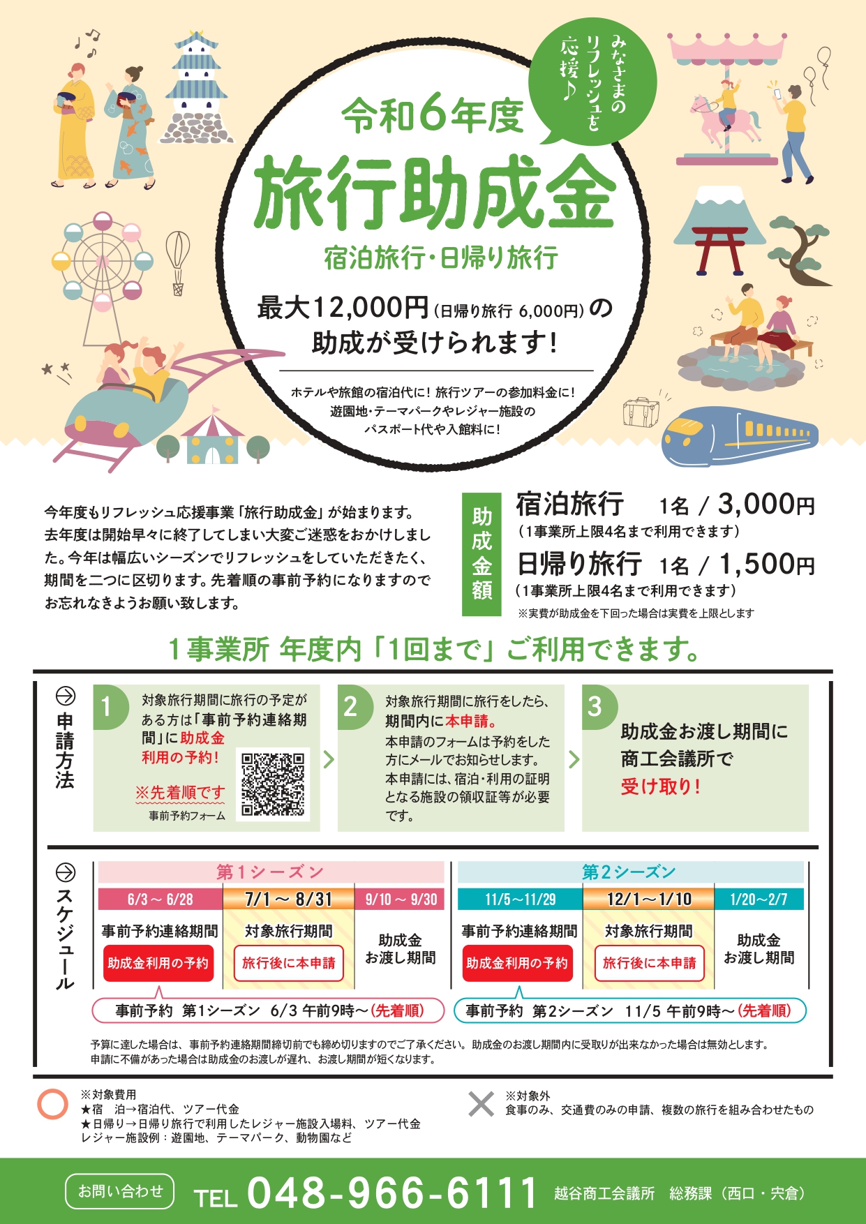 越谷商工会議所会員限定「旅行助成金【第1シーズン】」は、予算上限に達したため事前予約を終了しました。 なお、【第2シーズン】の事前予約は、11月5日(火)から開始します。対象の旅行期間は12月1日~1月10日です。ぜひ、ご利用ください。 詳しくはこちらのチラシ(PDF)をご覧ください。