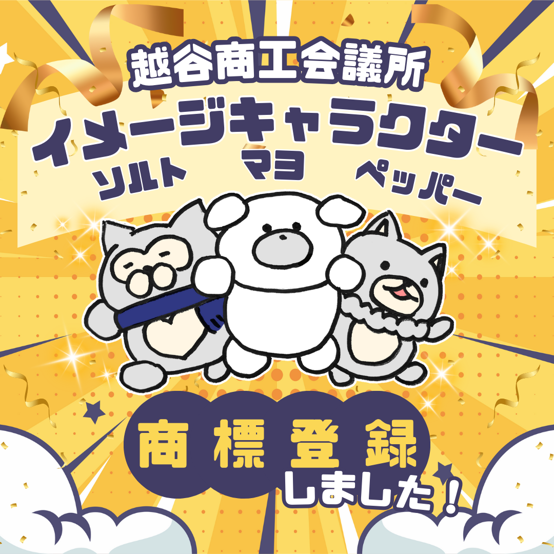 この度、越谷商工会議所イメージキャラクターの「ソルト・マヨ・ペッパー」を商標登録しました!今後は、会員限定で利用できるように準備を進めています!